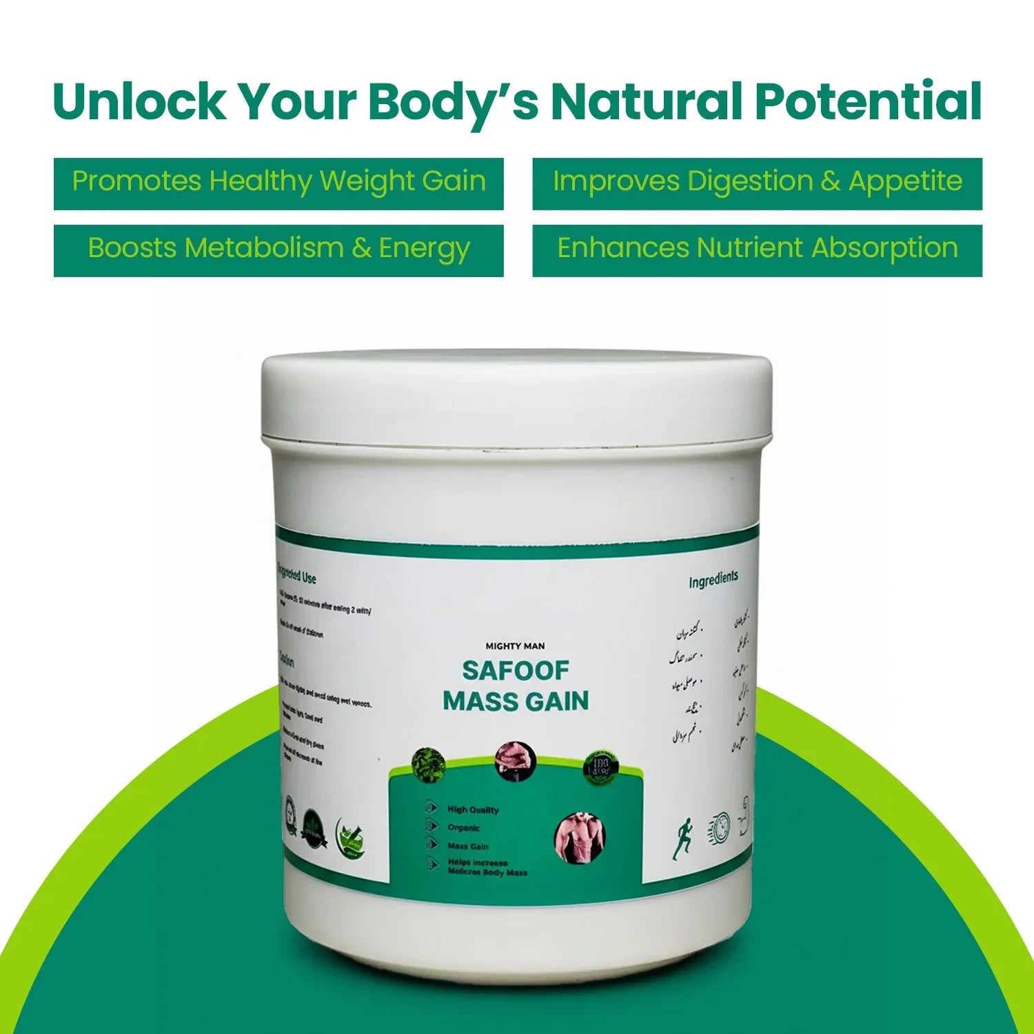 Safoof Mass Gain is made withpure herbal ingredientsthat help improve appetite, energy, and body strength. 🌿 It’s atraditional Desi formulatrusted for generations — now in an easy-to-use powder form!